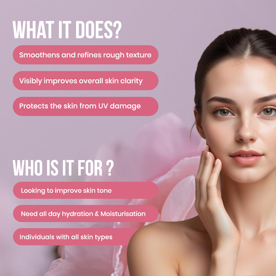 Hydrates, smooths, and protects with UVA/UVB defense, ensuring all-day moisture and glow.